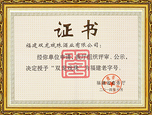 雙龍戲珠酒業(yè)作為福建省白酒研發(fā)中心,榮獲福建老字號產(chǎn)品、福建省農(nóng)業(yè)產(chǎn)業(yè)化龍頭企業(yè)、福建東南窖酒文化館、科技小巨人領軍企業(yè),國家守合同、重信用單位等榮譽。